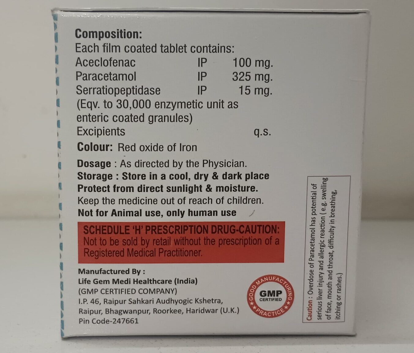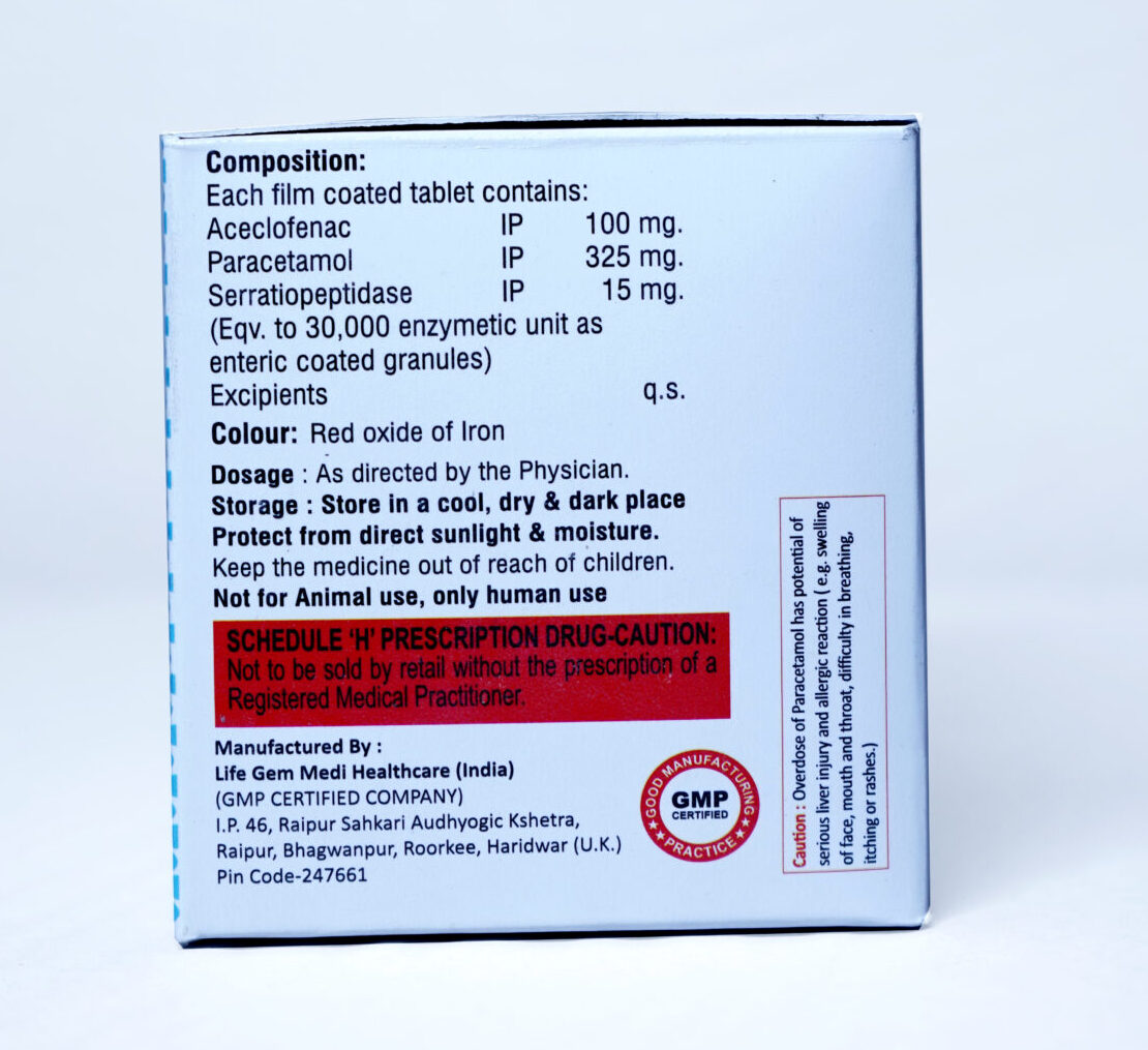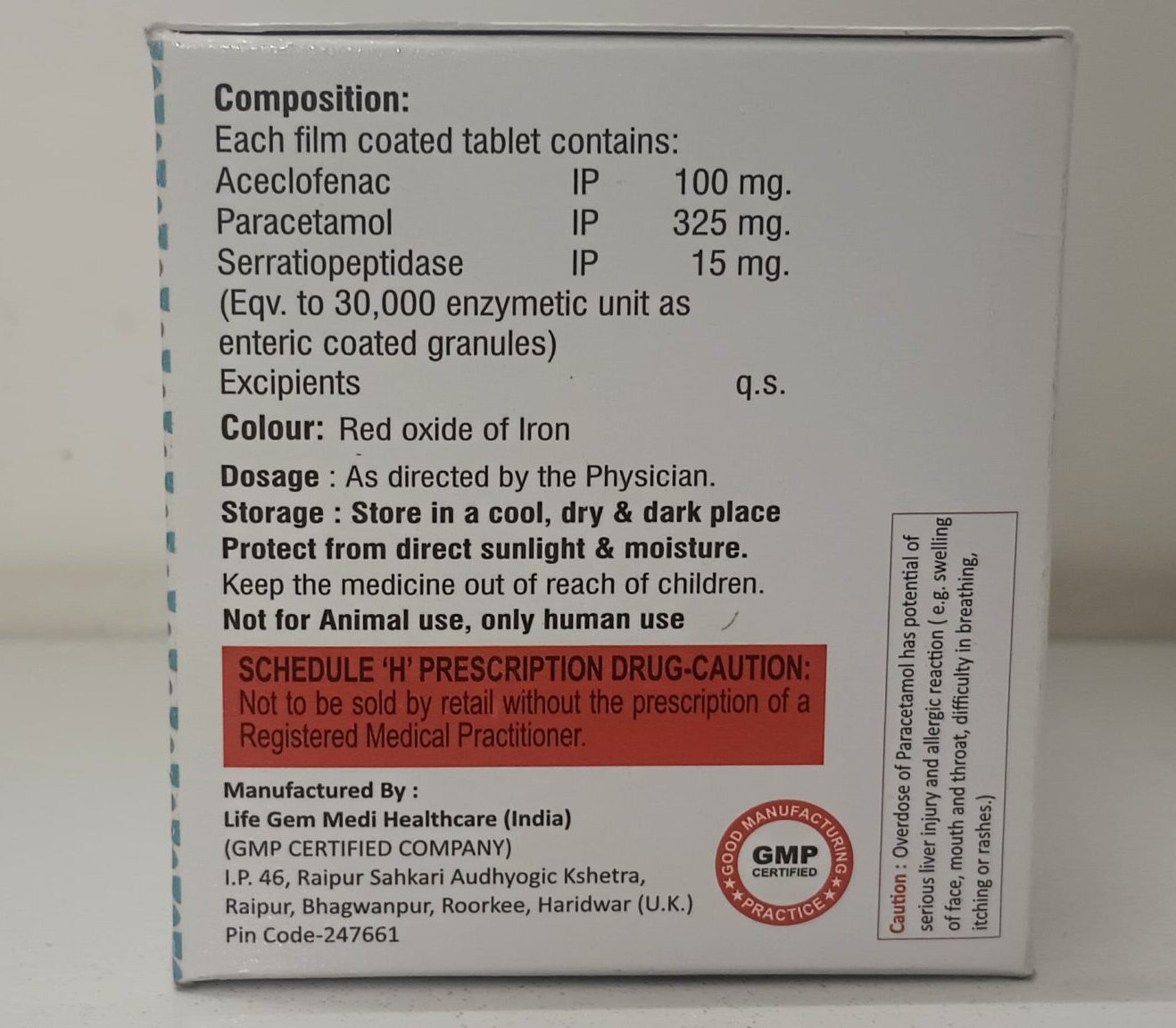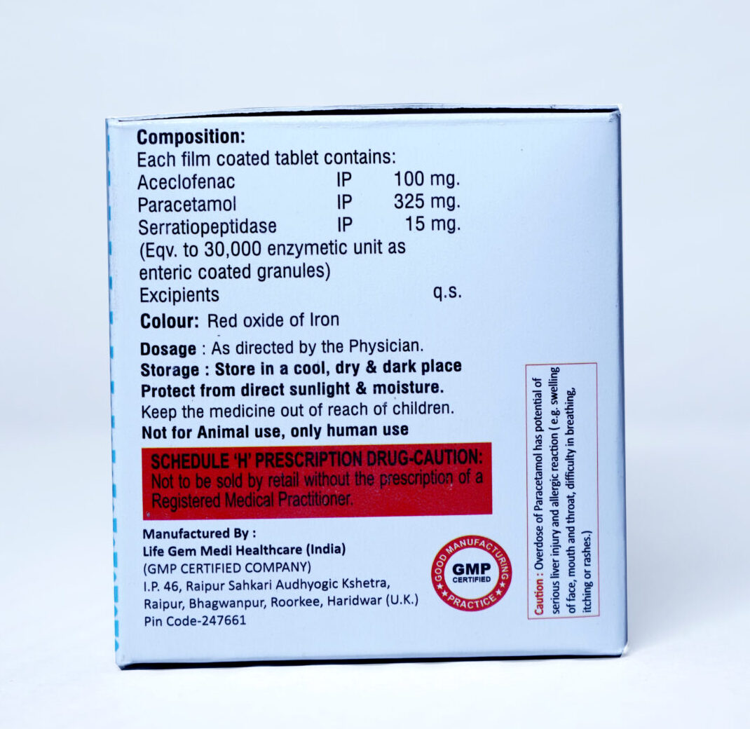 Aceclofenac Paracetamol Serratiopeptidase Uses The combination of Aceclofenac, Paracetamol and Serratiopeptidase are mainly used for the treatment and management of a vast number of conditions, mainly for Fever and flu, Bone and joint pain, Rheumatoid Arthritis, Osteoarthritis Headache, Mild migraine pain, Toothache, Ankylosing spondylitis, Menstrual pain, Cold and sore throat, Inflammation (swelling)